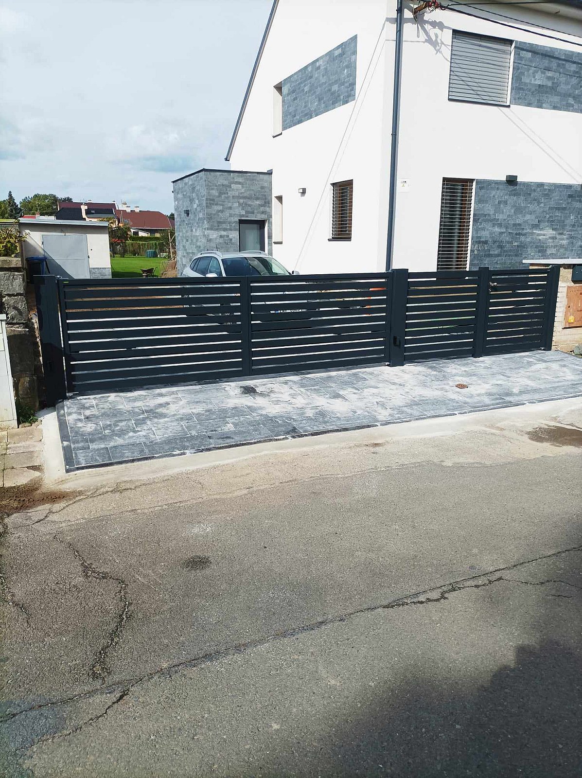 Na základě požadavku zákazníka obsahovalo toto oplocení pohyblivou dvoukřídlou bránu, vedle níž bylo umístěno plotové pole, které doplňavala vstupní branka. Všechny komponenty byly uchyceny do již dříve zabetonovaných hliníkových sloupků. Brána samotná obsahuje také senzory pro detekci pohybu v prostoru vjezdu. K bráně jsou také dodávány 2 dálkové ovladače, se kterýmy jste schopni bránu otevřít na velkou vzdálenost.